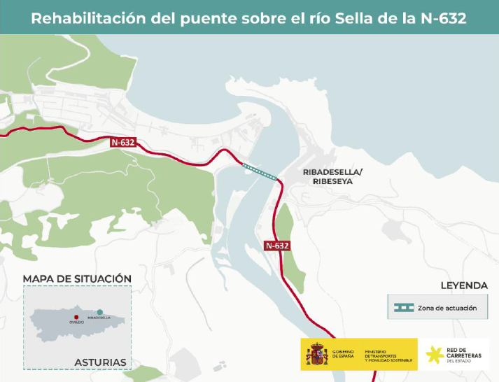 El Ministerio de Transportes y Movilidad Sostenible continúa con las obras para la rehabilitación estructural y funcional del puente sobre el río Sella situado en el kilómetro 3 de la N-632, en el municipio de Ribadesella,