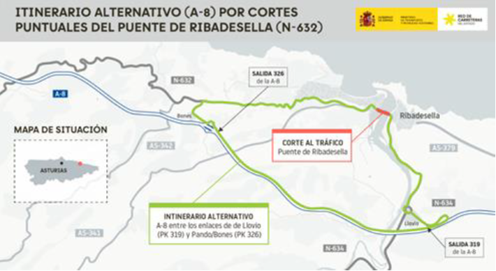 El itinerario alternativo previsto durante estos episodios será la A-8 entre los enlaces de Llovio (PK 319) y Pando/Bones (PK 326).