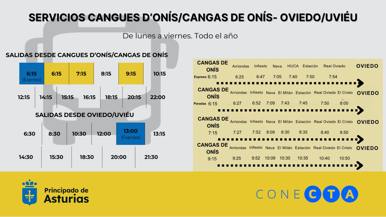 A partir del próximo lunes, 29 de septiembre, CTA ampliará paradas en los primeros servicios de mañana desde Cangues d'Onís/ Cangas de Onís en sentido hacia Oviedo/Uviéu para mejorar el servicio ajustándose a necesidades de los usuarios y usuarias. Las novedades son las siguientes: nueva parada en el Campus del Milán (C/Fernando Vela, 12) en los servicios con salida a las 6.15 (expedición con paradas), 7.15 y 9.15 horas.
