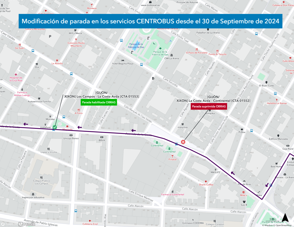 Debido a las obras de mejora del Parque del Continental, se anulará la parada El Continental (CTA 1552) y los servicios Centrobús pasarán a utilizar la parada de Los Campos (CTA 1553), ambas en la Avenida de la Costa.