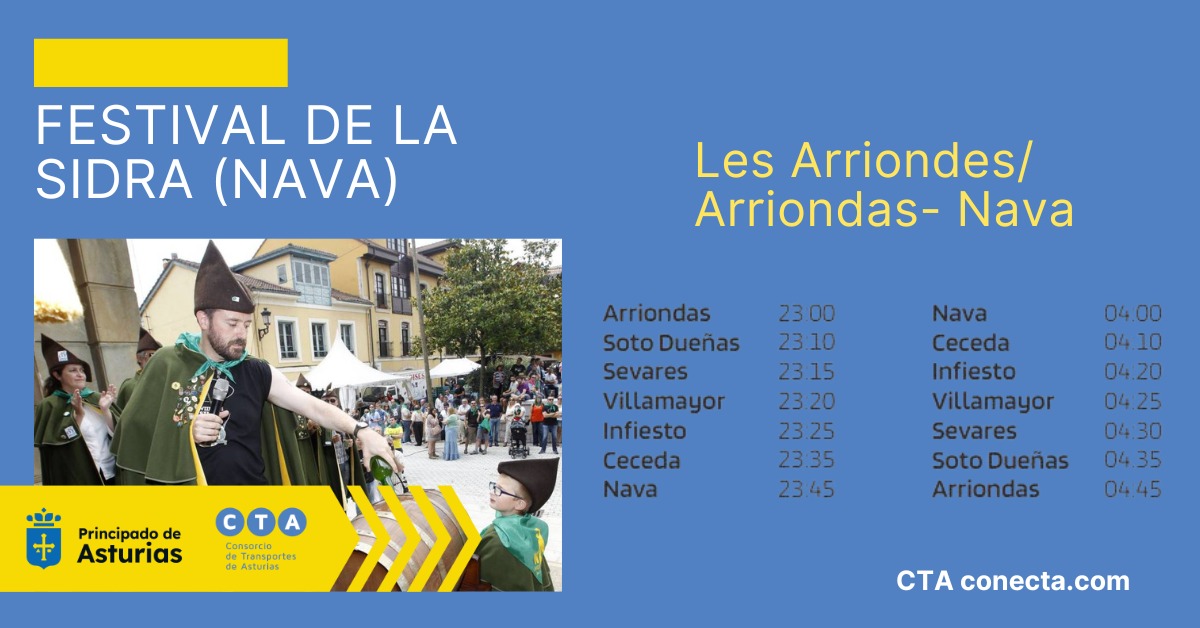 El Gobierno de Asturias, a través del Consorcio de Transportes de Asturias, con motivo del Festival de la Sidra de 2025 en la localidad asturiana de Nava, la noche del sábado 12 de julio y la madrugada del domingo 13 de julio, pondrá en marcha los siguientes servicios especiales de transporte de viajeros nocturnos: