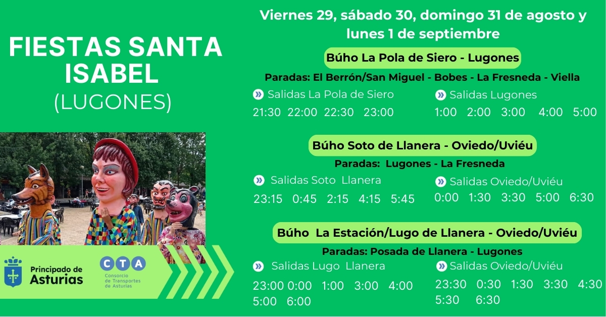 El Gobierno de Asturias, a través del Consorcio de Transportes de Asturias, con motivo de las fiestas de Santa Isabel en Lugones (Siero), pondrá en marcha los siguientes servicios especiales nocturnos de transporte de viajeros en las noches del viernes 29 de agosto, sábado 30 de agosto, domingo 31 de agosto y lunes 1 de septiembre: