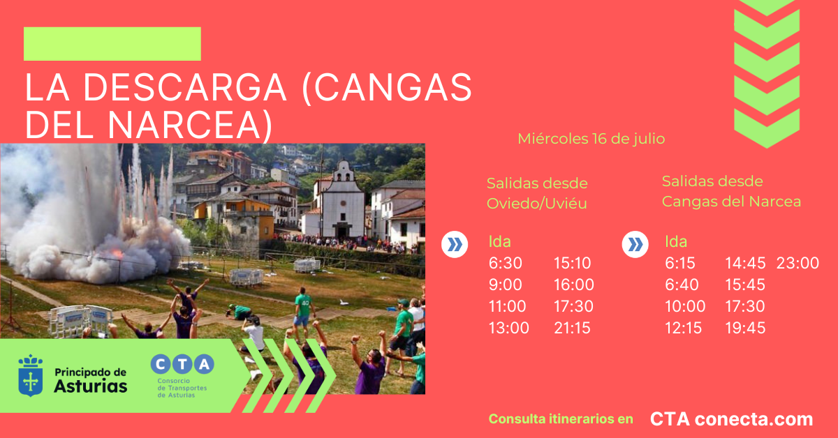 El Gobierno de Asturias, a través del Consorcio de Transportes de Asturias, con motivo de las fiestas de La Descarga en Cangas 2025, Cangas del Narcea, reforzará la línea Oviedo - Cangas del Narcea el próximo miércoles 16 de julio e incorporará un servicio específico Cangas del Narcea – Oviedo por Tineo, con salida de Cangas del Narcea a las 23:00 h.
