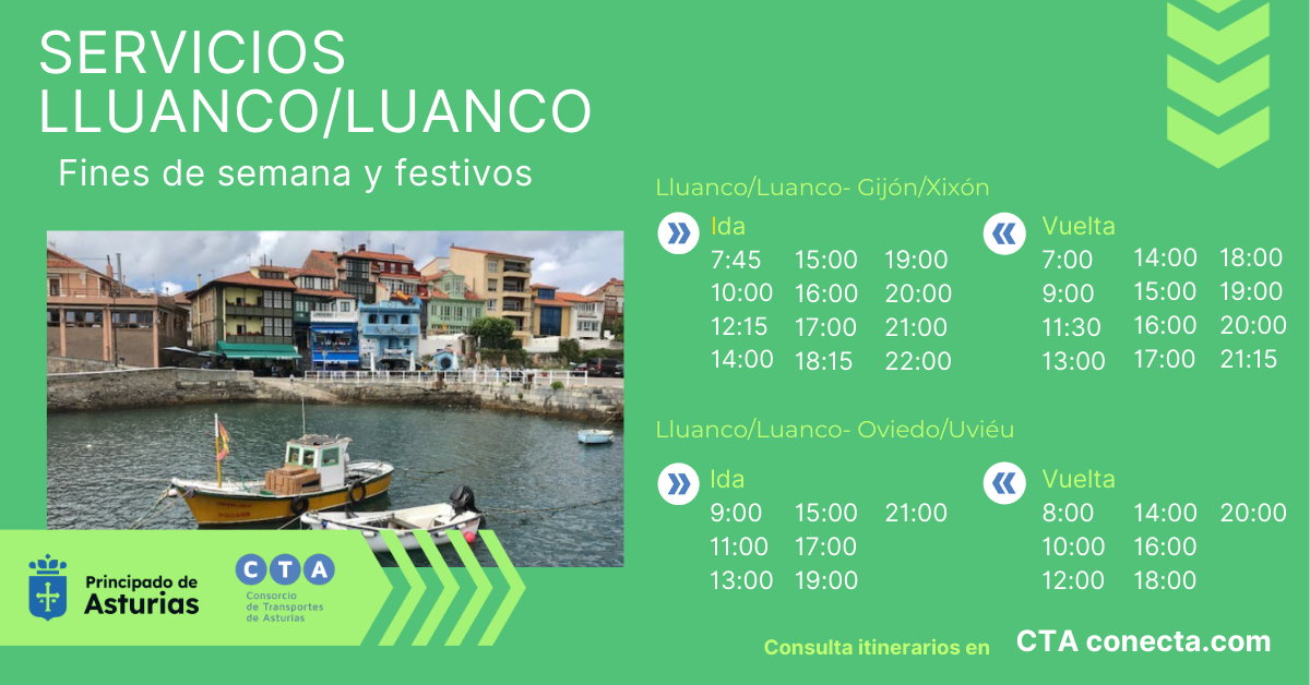 El Gobierno de Asturias mejora la oferta de transporte público para conectar Lluanco/Luanco con Oviedo/Uviéu y Gijón/Xixón los fines de semana y festivos. A partir del próximo sábado, 16 de noviembre, el Consorcio de Transportes de Asturias (CTA) ampliará su oferta de servicios de ocho a doce frecuencias al día en el caso de las rutas con Gijón/Xixón y de cinco a siete servicios para llegar a Oviedo/Uviéu.