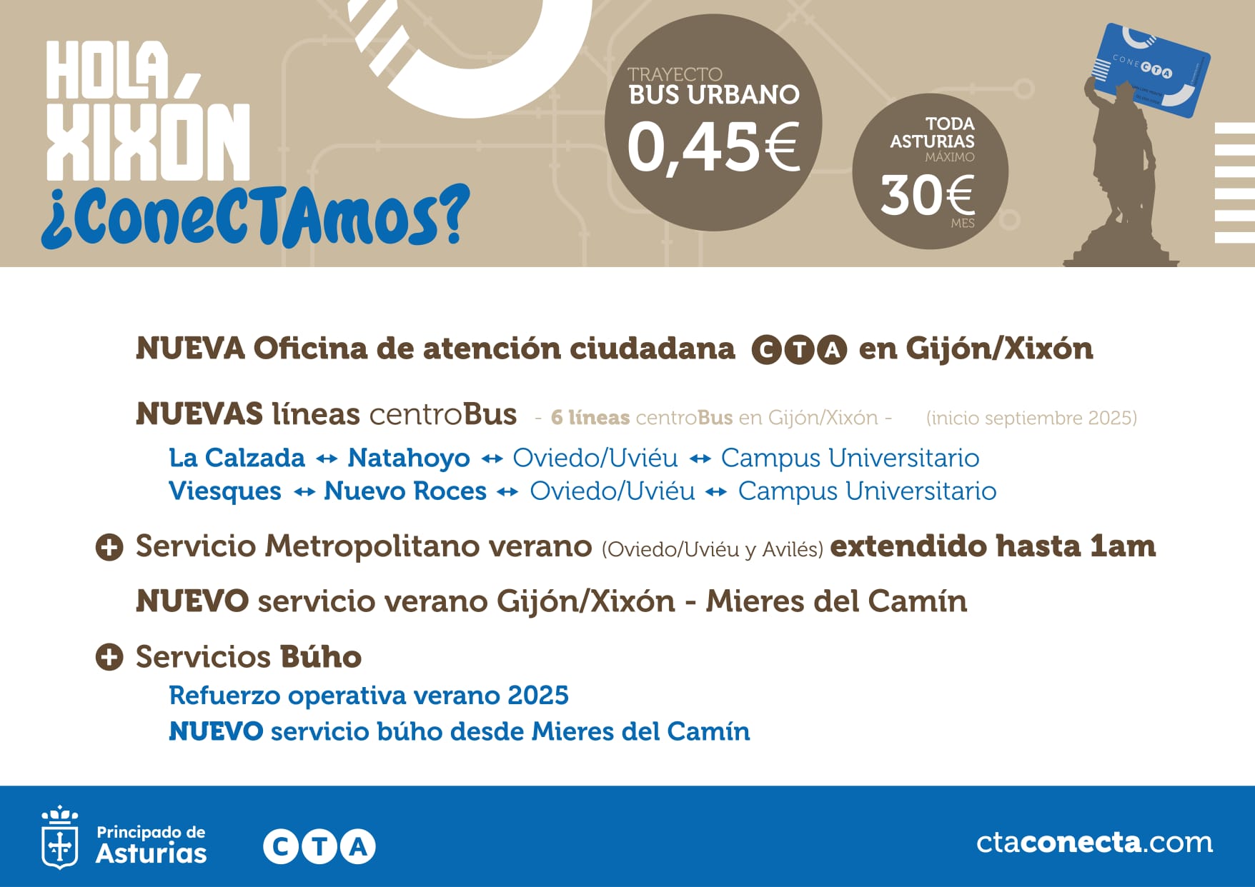 El Gobierno de Asturias pone en marcha, a través del Consorcio de Transportes de Asturias (CTA), un paquete de medidas para impulsar la movilidad sostenible en Gijón/Xixón y favorecer el uso del transporte público como servicio de calidad, accesible y que facilite la equidad y la cohesión territorial. Entre ellas, destaca la apertura de una oficina de atención ciudadana en la estación de autobuses para informar sobre novedades, prestaciones y tarifas, además de solicitar presencialmente la tarjeta CONECTA. Permanecerá abierta al público de lunes a viernes, de 09:00 a 14:00 horas.