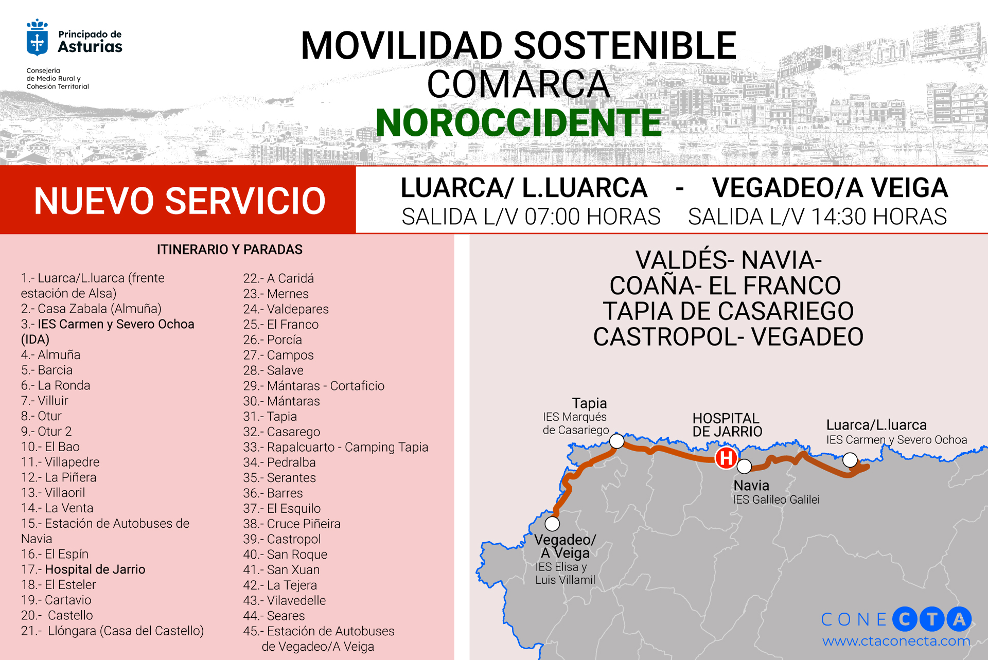 La nueva ruta partirá de Luarca/L.luarca, de lunes a viernes, a las 07:00 horas y regresará a las 14:30 desde Vegadeo/A Veiga, con paradas en todos los concejos de la costa occidental: Valdés, Navia, Coaña, El Franco, Tapia de Casariego, Castropol y Vegadeo. De este modo, vertebrará los centros educativos de Secundaria Carmen y Severo Ochoa (Luarca/L.luarca), Galileo Galilei (Navia), Marqués de Casariego (Tapia) y Elisa y Luis Villamil (Vegadeo), así como el Hospital de Jarrio.