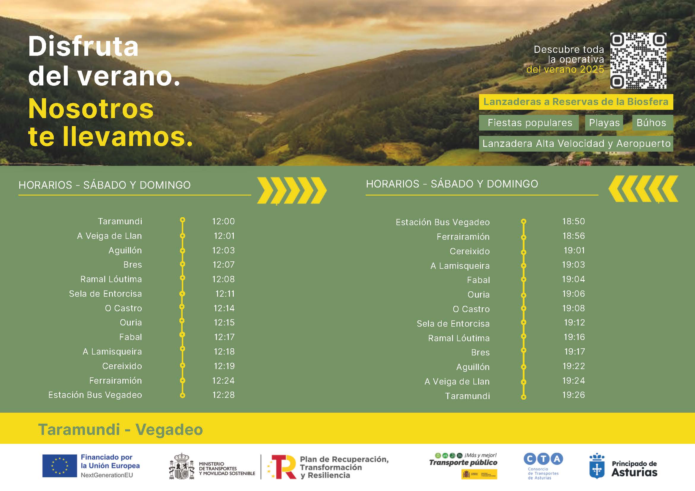 Salidas a las 12:00 horas desde Taramundi y regreso desde A Veiga/Vegadeo a las 18.50 horas.