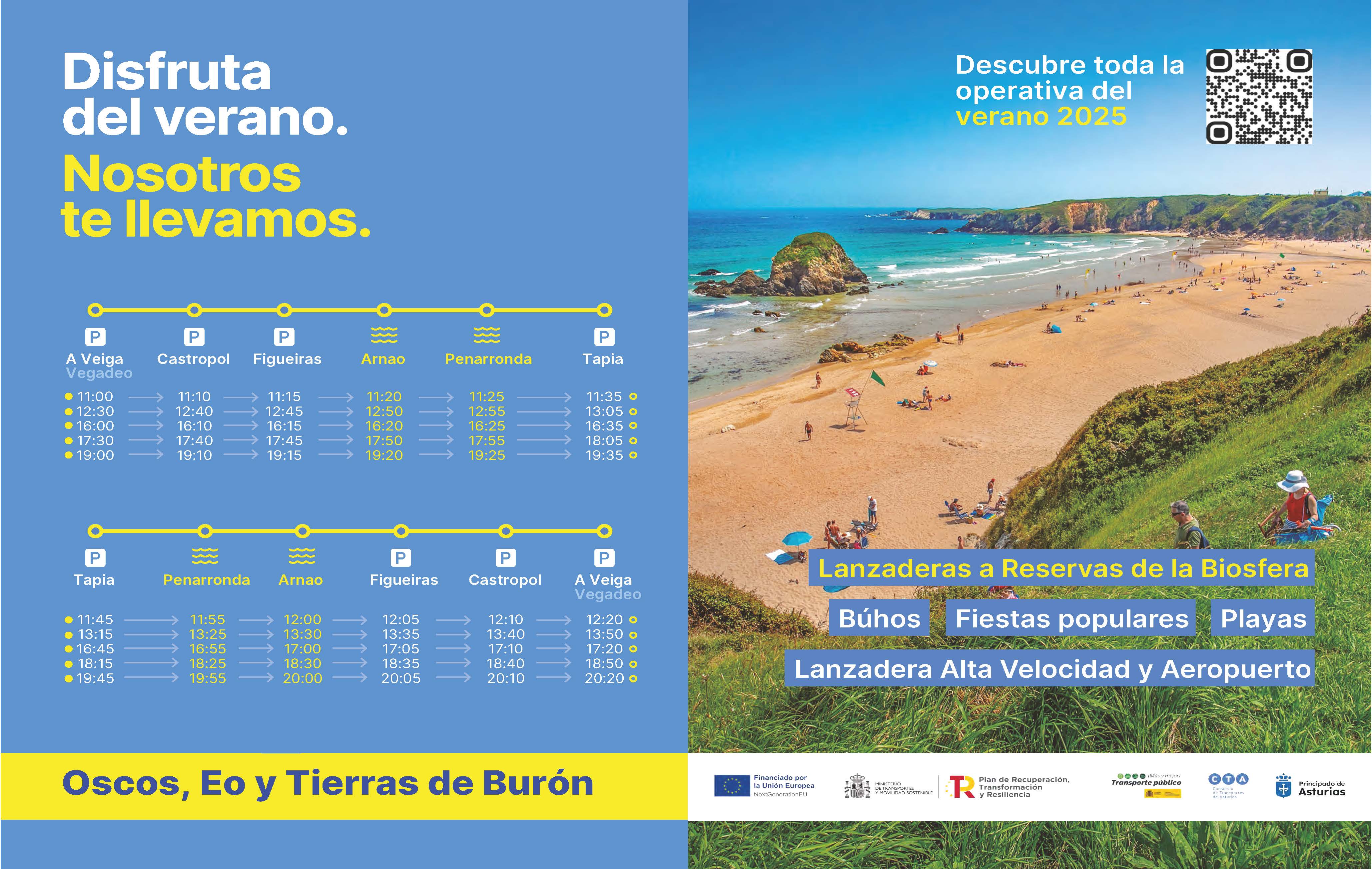 Una nueva línea diariamente durante el verano une A Veiga/Vegadeo y Tapia facilitando el acceso a las playas de Arnao y Penarronda y haciendo parada en las localidades de Castropol y As Figueiras.